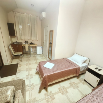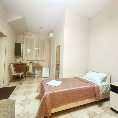 - Современные оборудованные номера: кондиционер, холодильник, телевизор, душ, c/у, полотенца, постельное белье, фен, шкаф;